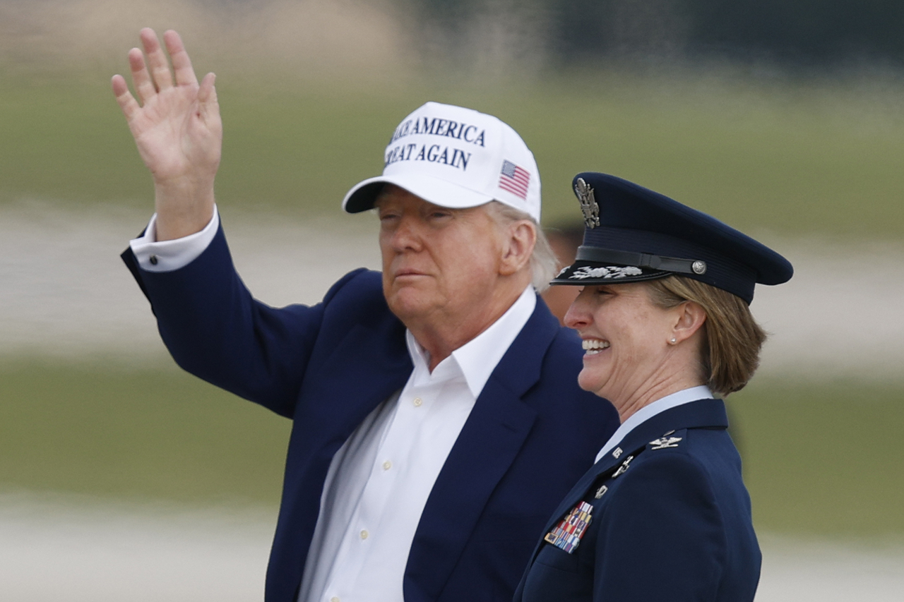 | 도널드 트럼프 미국 대통령이 25일(현지시간) 미 공군 앤드류스 기지에서 전용헬기 마린원에 탑승하며 손을 흔들고 있다. [AP] |