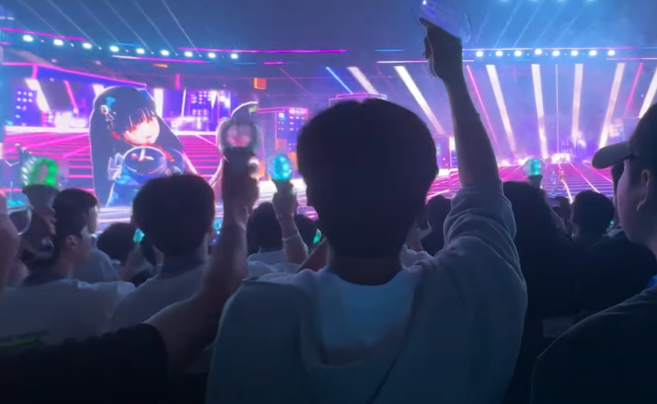 | 지난 17일 고척스카이돔에서 열린 ‘이세계 페스티벌 2025’에서 버츄얼 아이돌 ‘이세계 아이돌’의 공연을 보고 팬들이 환호하는 모습. [유튜브 김진아 갈무리] |