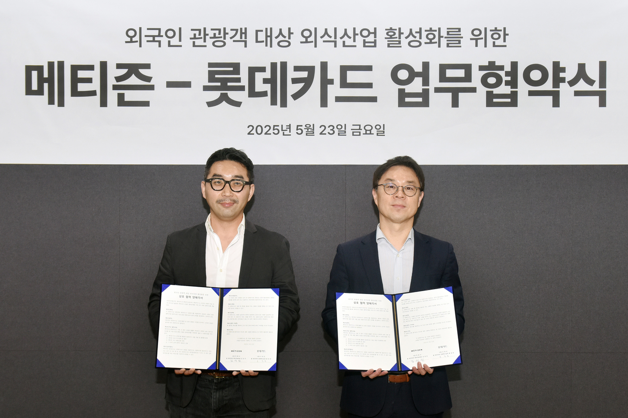 | 롯데카드는 미식 큐레이션 플랫폼 ‘메티즌’과 외국인 관광객 대상 외식산업 활성화를 위해 지난 23일 업무협약을 체결했다고 26일 밝혔다. 이번 협약식은 서울 종로구 롯데카드 본사에서 캐비아M(이하 메티즌) 김성민(왼쪽) 운영 총괄과 롯데카드 홍경완 경영혁신실장 등 양사 관계자가 참석한 가운데 진행됐다. 메티즌은 미슐랭 레스토랑, 파인 다이닝, 노포식당 등 폭넓은 미식 콘텐츠를 운영하고, 미식과 체험을 연계한 상품을 판매하는 등 국내외 미식경험의 영역을 확장하고 있는 기업이다. 정호원기자 |
