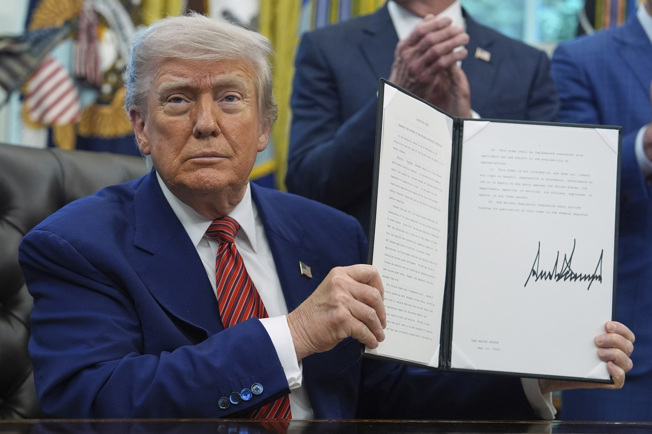 | 도널드 트럼프 미국 대통령이 지난 23일(현지시간) 백악관 집무실에서 원전 관련 행정명령에 서명하고 이를 들어 보이고 있다. 이번 행정명령에는 원자력규제위원회(NRC) 개혁, 에너지부 내 원자력 에너지 연구 개혁, 연방 정부 토지 내 원전 건립, 미국 내 우라늄 채굴 및 농축 확대 등에 대한 내용이 담겼다. [AP] |