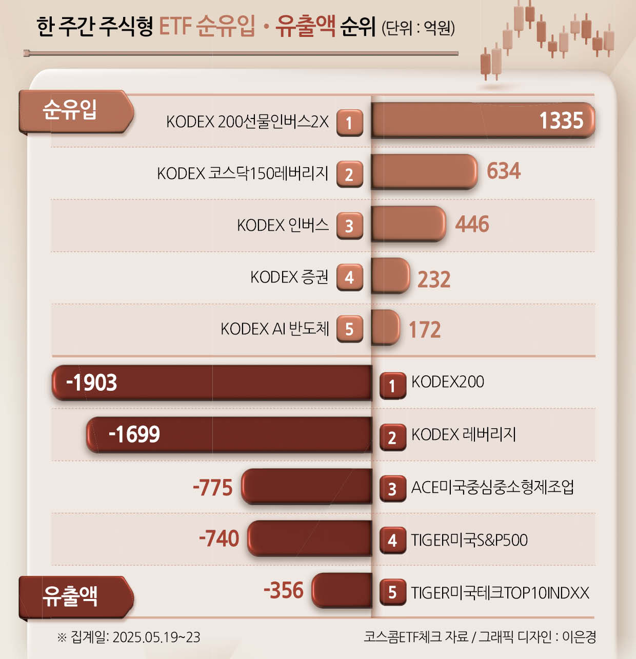 같은 기간 순유출액 순위를 보면 방향은 더 뚜렷하다. 자금이 가장 많이 빠져나간 ETF는 코스피 대표 200종목에 투자하는 KODEX200 (-1903억원) 다음으로 KODEX 레버리지(-1699억원)가 차지했다.