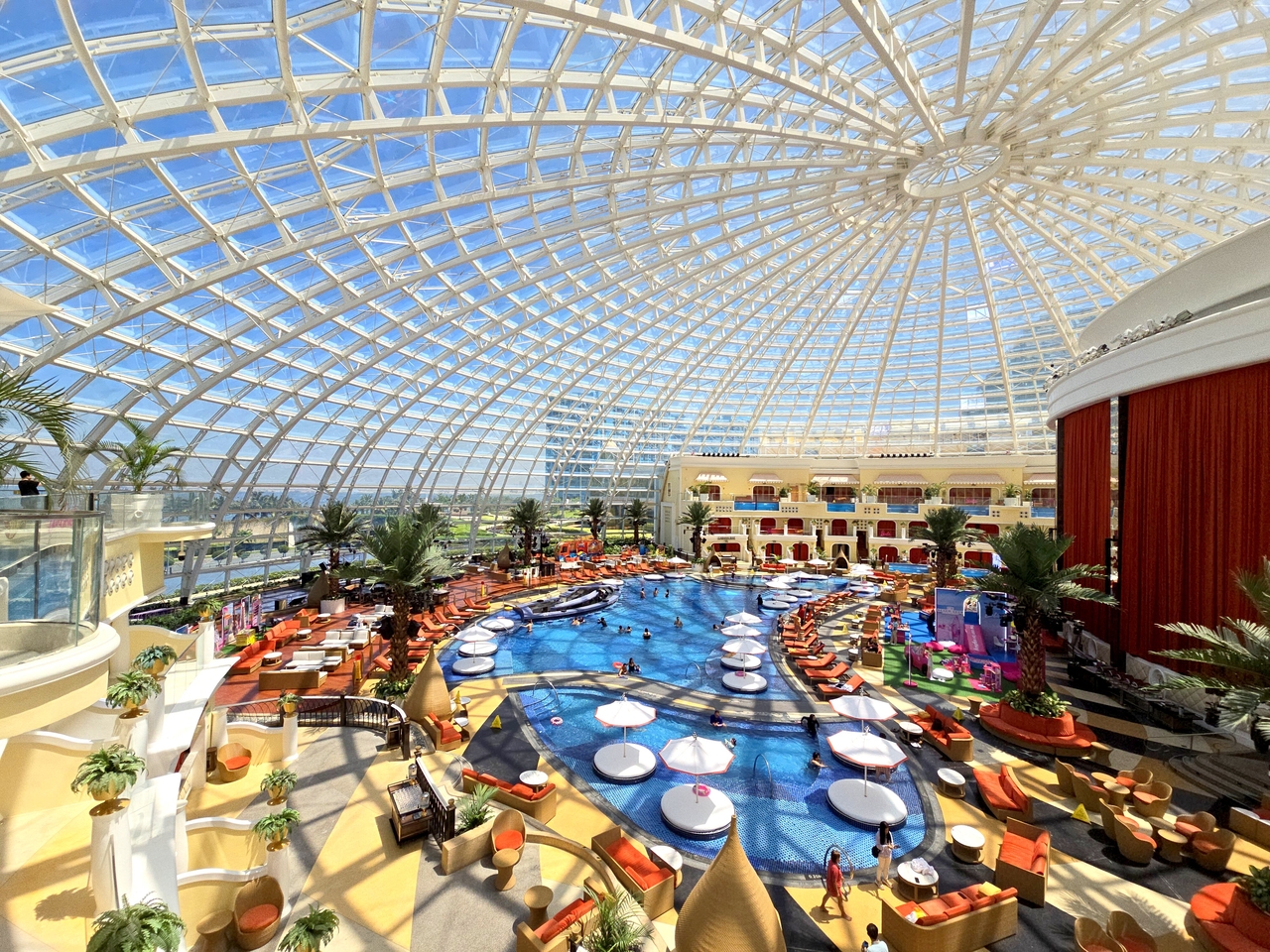 지름 90m, 높이 30m 규모의 자외선 차단 유리 돔으로 둘러싸인 이곳은 면적이 9만㎡에 달하지만 기둥은 없다. 최대 5000명까지 수용한다.