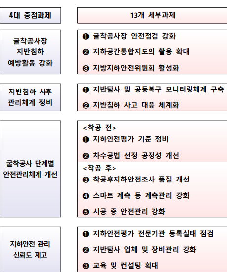 구체적으로 ▷굴착공사장 지반침하 예방활동 강화 ▷지반침하 사후관리체계 정비 ▷굴착공사 단계별 안전관리체계 개선 ▷지하안전관리 신뢰도 제고 등 4대 중점과제 및 13개 세부과제가 담겼다.
