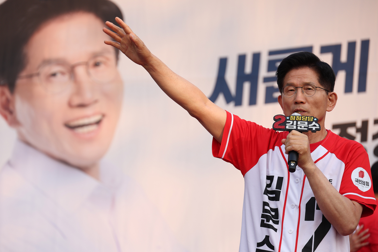 | 김문수 국민의힘 대선후보가 26일 서울 도봉구 방학사거리에서 집중유세를 하고 있다. [연합] |