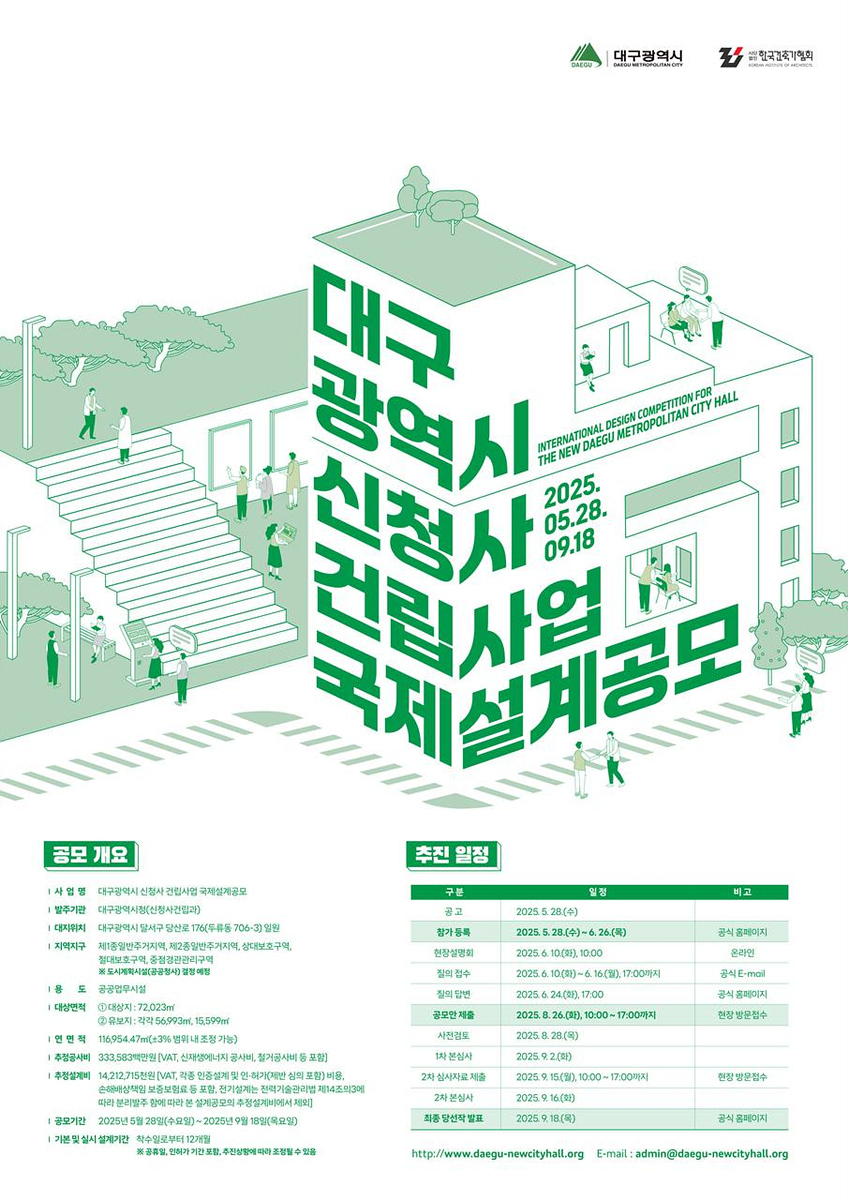 자세한 공모 내용은 건축행정시스템 ‘세움터’, 대구시청 홈페이지 및 신청사 설계공모 공식 홈페이지에서 확인할 수 있다.