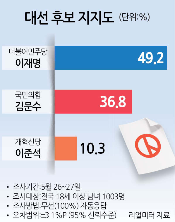 리얼미터가 에너지경제신문 의뢰로 지난 26~27일 전국 18세 이상 유권자 1003명을 대상으로 대선 후보 지지도를 조사한 결과(5월 5주차) 이재명 후보는 49.2%를 기록했다. (신뢰수준 95%, 표본오차 ±3.1%p) 지난 24일 발표된 리얼미터의 직전 조사(5월 4주차)와 비교해 이재명 후보는 2.6%p가 오른 것으로 나타났다. 28일부터 이른바 ‘깜깜이’ 기간으로 불리는 여론조사 결과 공표 금지 기간이 시작됐는데, 이번 조사는 금지 기간 시작 직전 이틀간 이뤄졌다.