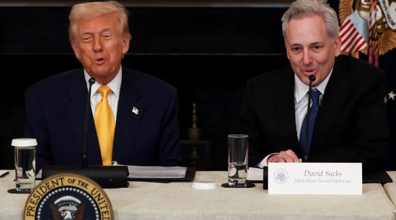 | 지난 3월 미국 백악관에서 도널드 트럼프 미국 대통령(왼쪽)과 백악관 인공지능(AI)·가상화폐 정책을 총괄하는 데이비드 색스 고문이 회의에 참석했다. [로이터] |
