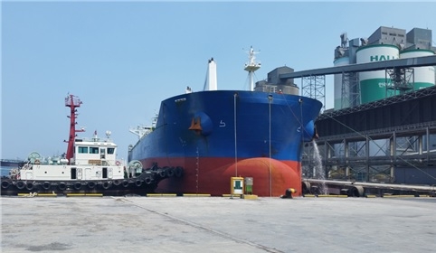 | 한라시멘트의 수출 선박이 강릉 옥게항에 출항대기 하고 있다. |