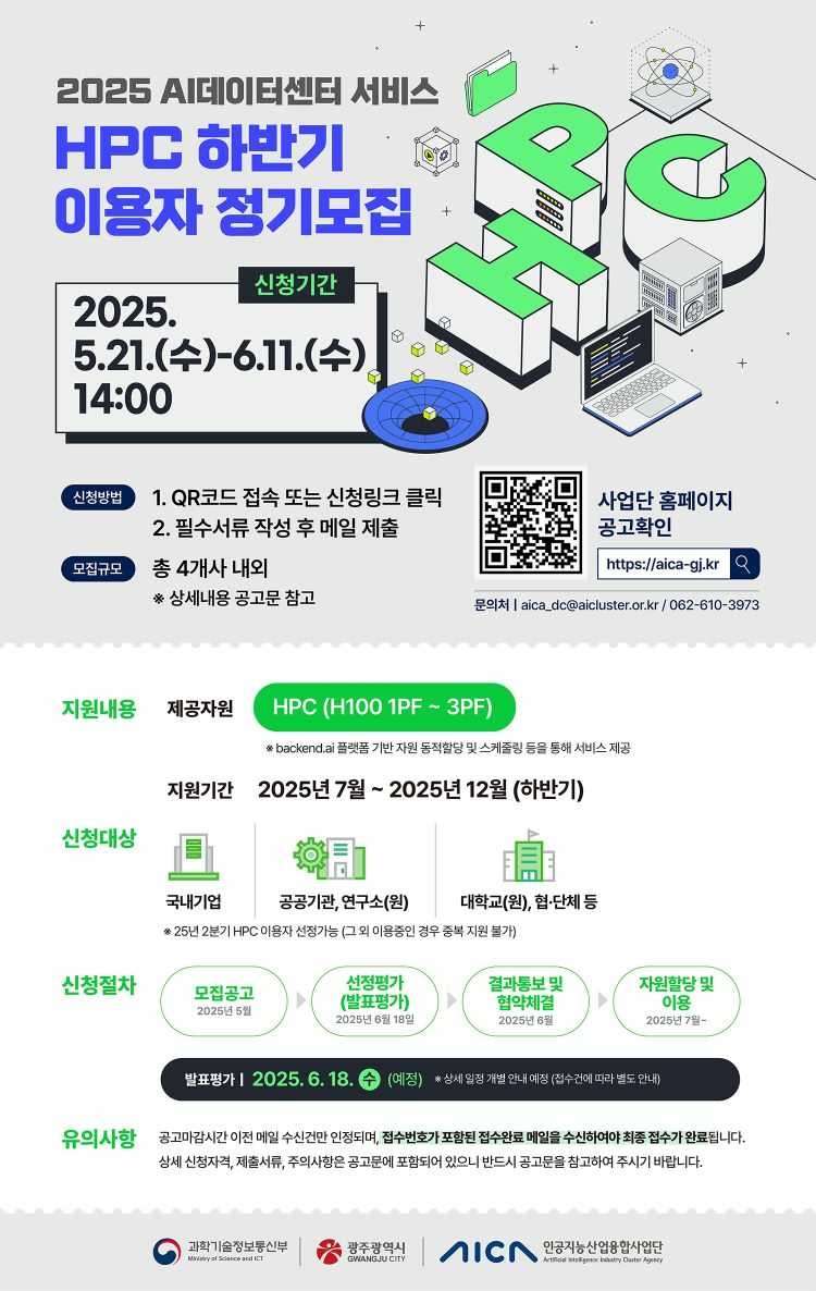 | 인공지능산업융합사업단은 2025년 하반기 ‘AI 데이터센터 서비스’를 통해 HPC 자원 이용자를 오는 6월 11일까지 공개 모집한다 |