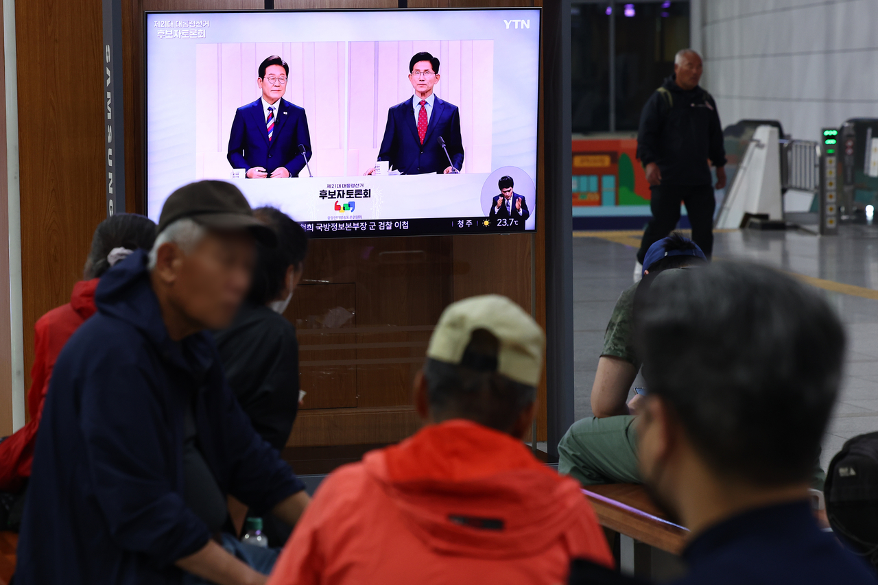 | 제21대 대통령선거 후보 3차 정치분야 TV 토론회가 열린 27일 서울역 대합실에서 시민들이 토론회 중계방송을 지켜보고 있다. [연합] |