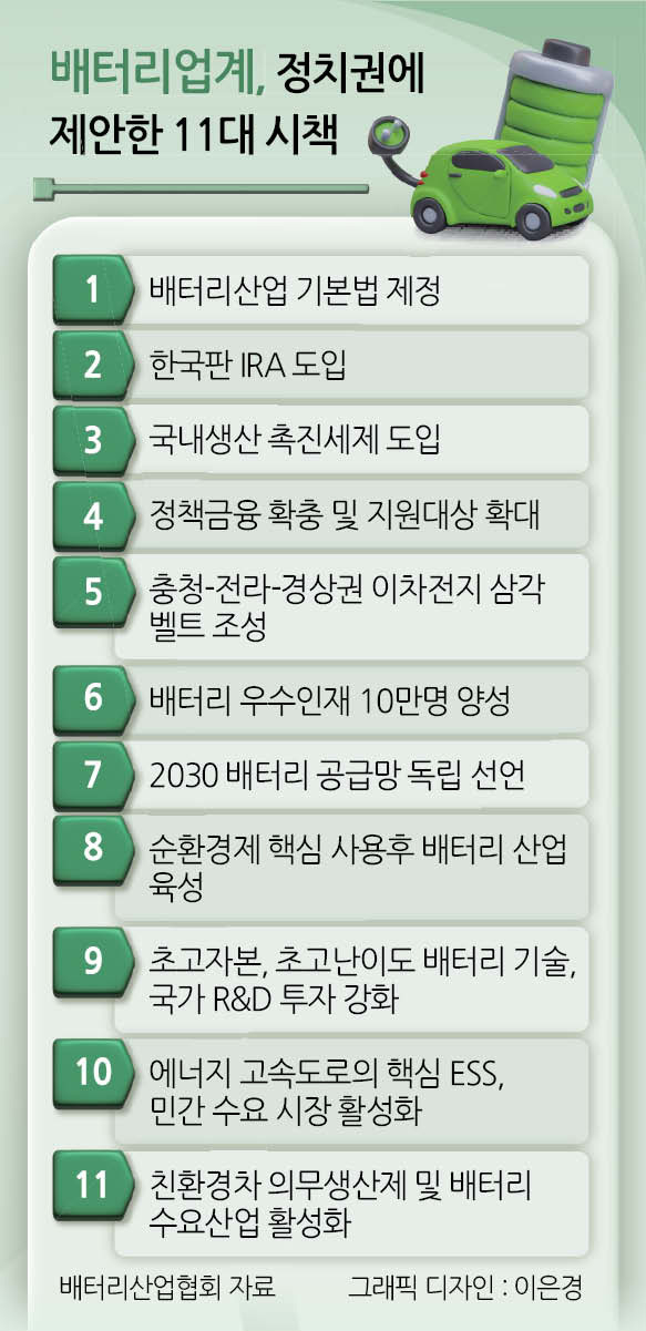건의서에 제안된 3대 공약은 ▷한국판 IRA(인플레이션감축법) 도입을 위한 ‘배터리산업 기본법(가칭)’ 제정 ▷공급망 독립 ▷차세대 배터리 초격차 경쟁력 확보 등 세 가지로 구성된다. 11대 시책은 각각의 공약 밑에 세부내용으로 기재되는 구조로 이뤄졌다.