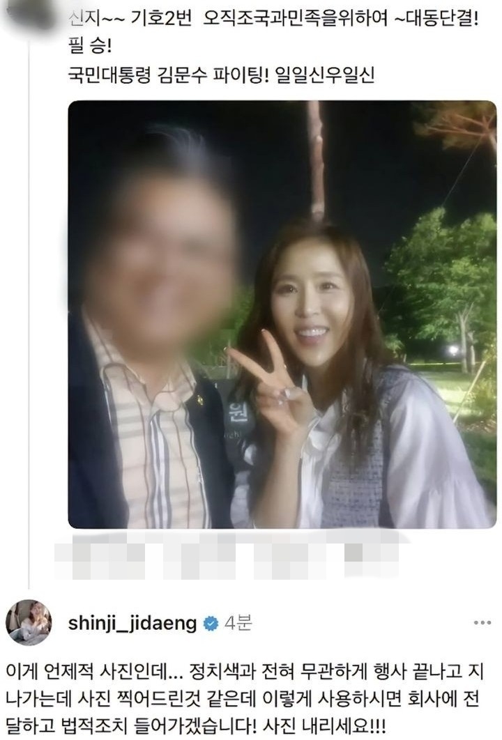 이에 대해 신지는 “이게 언제적 사진인데”라며 “정치색과 무관하게 행사 끝나고 지나가는데 사진 찍어드린 것 같은데 사용하시면 회사에 전달하고 법적조치 들어가겠다. 사진 내리세요”라고 경고했다.