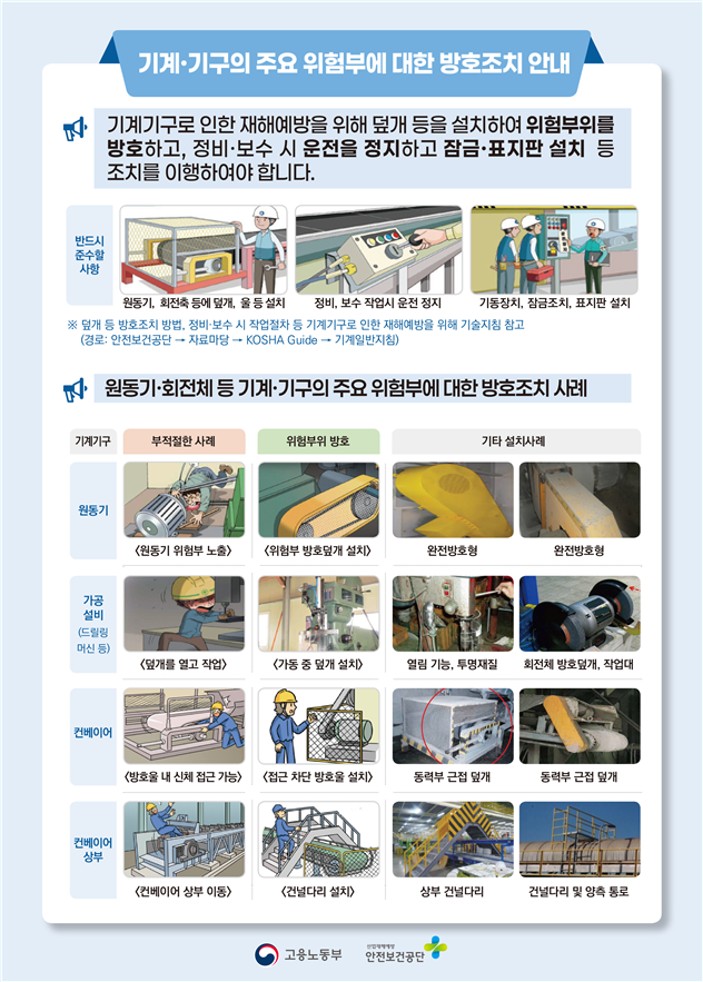 최태호 산재예방감독정책관은 “끼임 사고는 덮개 등 방호장치 설치, 기계 정비 시 운전정지(LOTO, Lock Out Tag Out) 등 기본 안전수칙 준수가 무엇보다 중요하다”며 “정부는 사업장의 충분한 안전 조치 여부를 확인하기 위해 현장 중심의 감독·점검을 이어나갈 것”이라고 강조했다.