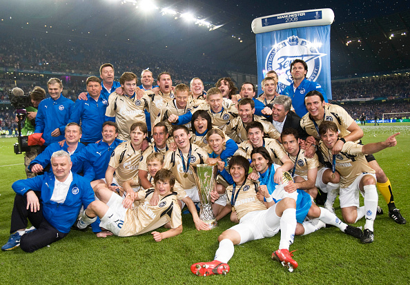 | 러시아 제니트 선수들이 2007-2008 UEFA컵 우승을 차지한 후 단체 촬영을 하며 즐거워 하고 있다. 선수들 가운데 김동진과 이호의 모습이 보인다. [게티이미지] |