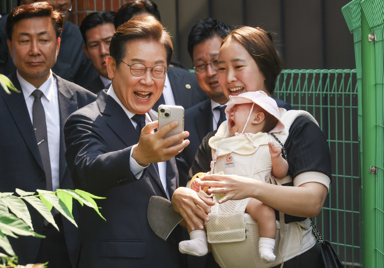 | 이재명(왼쪽) 더불어민주당 대선 후보가 제21대 대통령 선거 사전 투표 첫날인 29일 오전 서울 서대문구 신촌동 주민센터 투표소에서 한 시민과 함께 기념촬영을 하고 있다. 임세준 기자 |