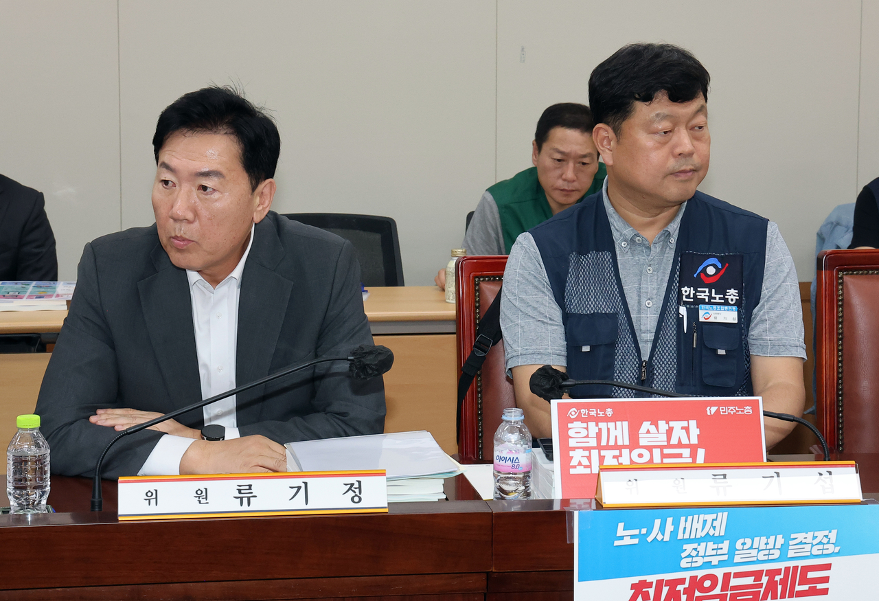 | 최저임금위원회 사용자위원인 류기정 한국경영자총협회 전무(왼쪽)와 근로자위원 류기섭 한국노총 사무총장이 29일 정부세종청사에서 열린 최저임금위원회 제3차 전원회의에서 나란히 자리하고 있다. [연합] |
