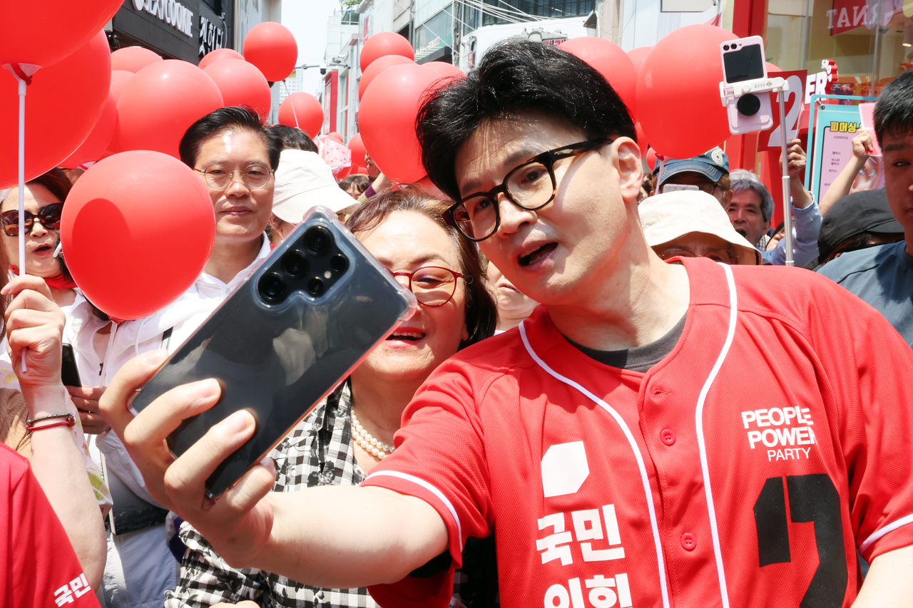 | 제21대 대통령선거 사전투표 첫날인 29일 오후 광주 동구 충장로우체국 앞에서 국민의힘 한동훈 전 대표가 유세를 마친 뒤 지지자와 기념 사진을 찍고 있다. <연합뉴스> |