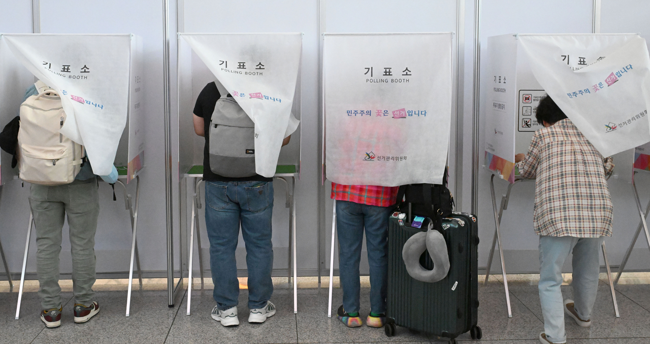 | 이날 오전 인천국제공항 제1여객터미널 출국장에 마련된 사전투표소에서 유권자들이 투표를 하고 있는 모습. 영종도=이상섭 기자 |