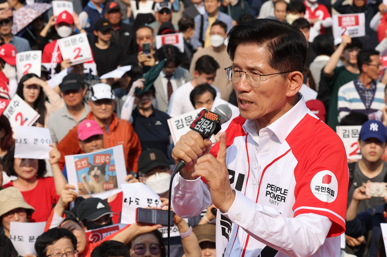 김 후보는 이 후보를 겨냥해 “도둑놈이 거꾸로 경찰 몽둥이를 뺏어서 경찰을 두들겨 패고 검사를 탄핵하고 판사를 탄핵하고 도둑놈 세상이 되는 것이 적반하장”이라고 비난했다.