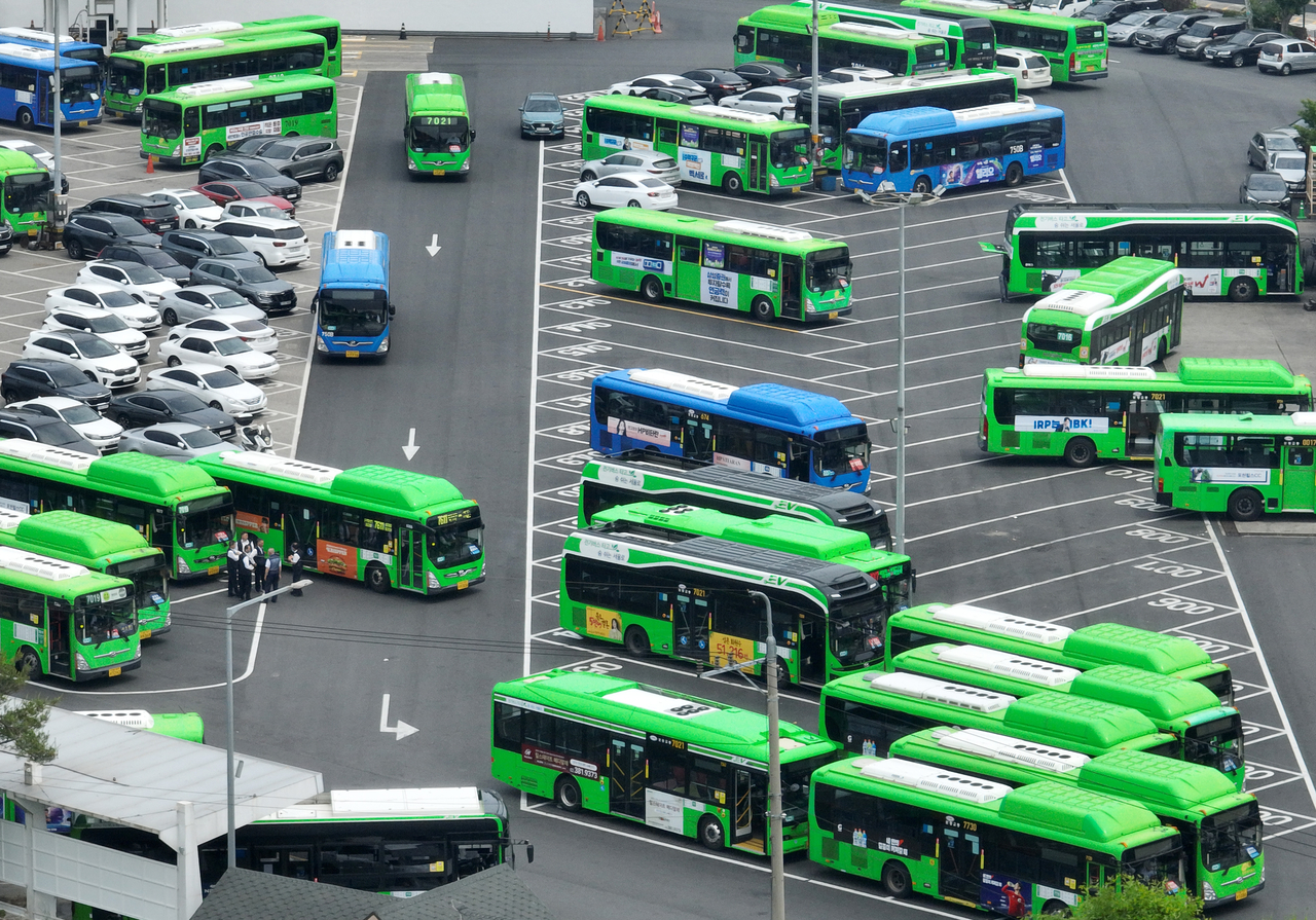 | 서울 시내버스 노조가 임금·단체협약(임단협) 협상이 결렬됐지만 예고한 파업을 미루기로 한 28일 서울 시내의 한 공영버스 차고지에 버스들이 세워져 있다. 파업이 유보됨에 따라 이날 첫차부터 파업 예정이었던 서울 시내버스는 첫차부터 정상 운행됐다. <연합뉴스> |