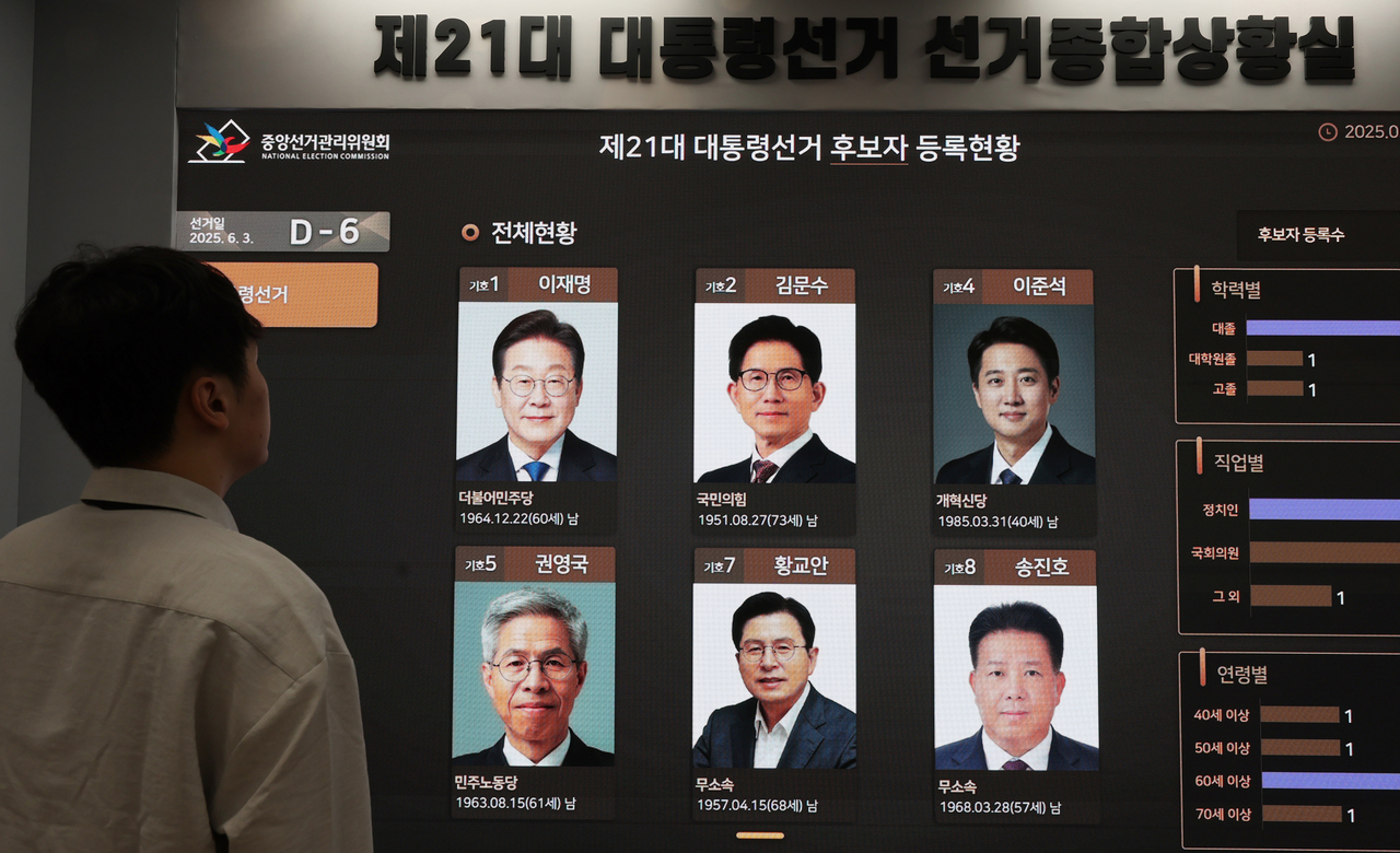 | 경기도 과천시 중앙선거관리위원회에서 한 직원이 제21대 대통령 선거 후보자 등록현황 상황판을 보고 있다. [연합] |