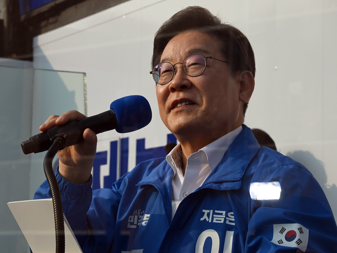 | 이재명 더불어민주당 대선 후보가 29일 오후 서울 서초구 서울고속버스터미널 광장에서 열린 유세에 참석해 지지를 호소하고 있다. 임세준 기자 |