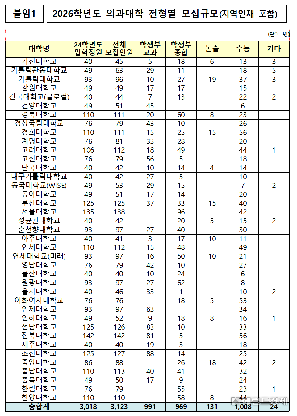 30일 교육부가 발표한 ‘2026학년도 의과대학 대입전형시행계획 주요사항’에 따르면 2026학년도 의대 모집인원은 3123명(수도권 1023명·비수도권 2100명)이다.
