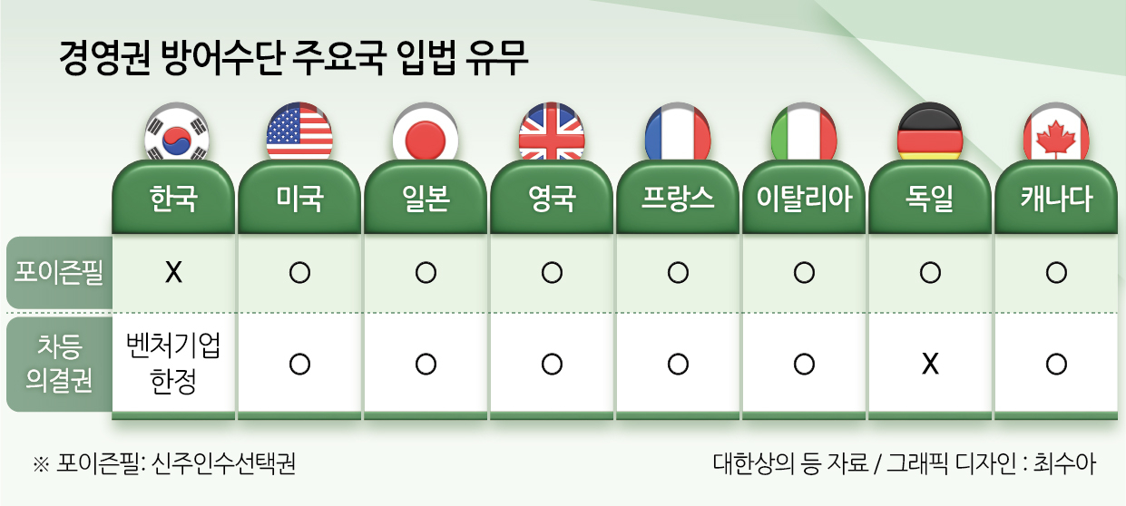 G7과 달리 한국은 포이즌필을 도입하지 않고 있다. 2010년 포이즌필 도입을 시도했지만 국회 논의 과정에서 무산됐다. 차등의결권은 2023년 7월부터 벤처기업 창업주에 한해 예외적으로 허용하고 있다. 제도 부재로 우리나라 대기업들이 선택할 수 있는 경영권 방어 수단은 자사주 취득이 사실상 전부다.