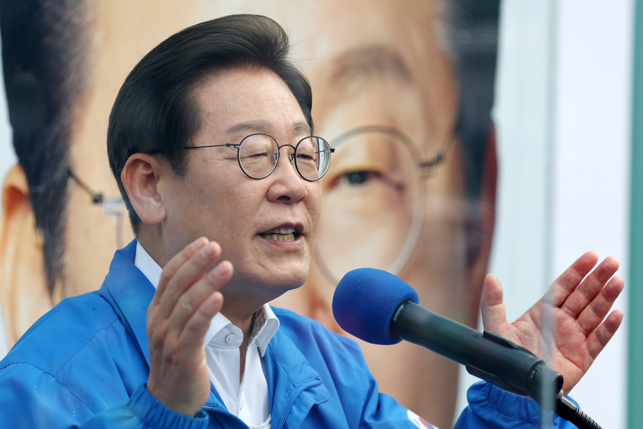 | 이재명 더불어민주당 대선 후보가 지난달 29일 서울 송파구 잠실종합운동장 광장에서 열린 강동구·송파구 집중 유세에서 지지를 호소하고 있다. [연합] |