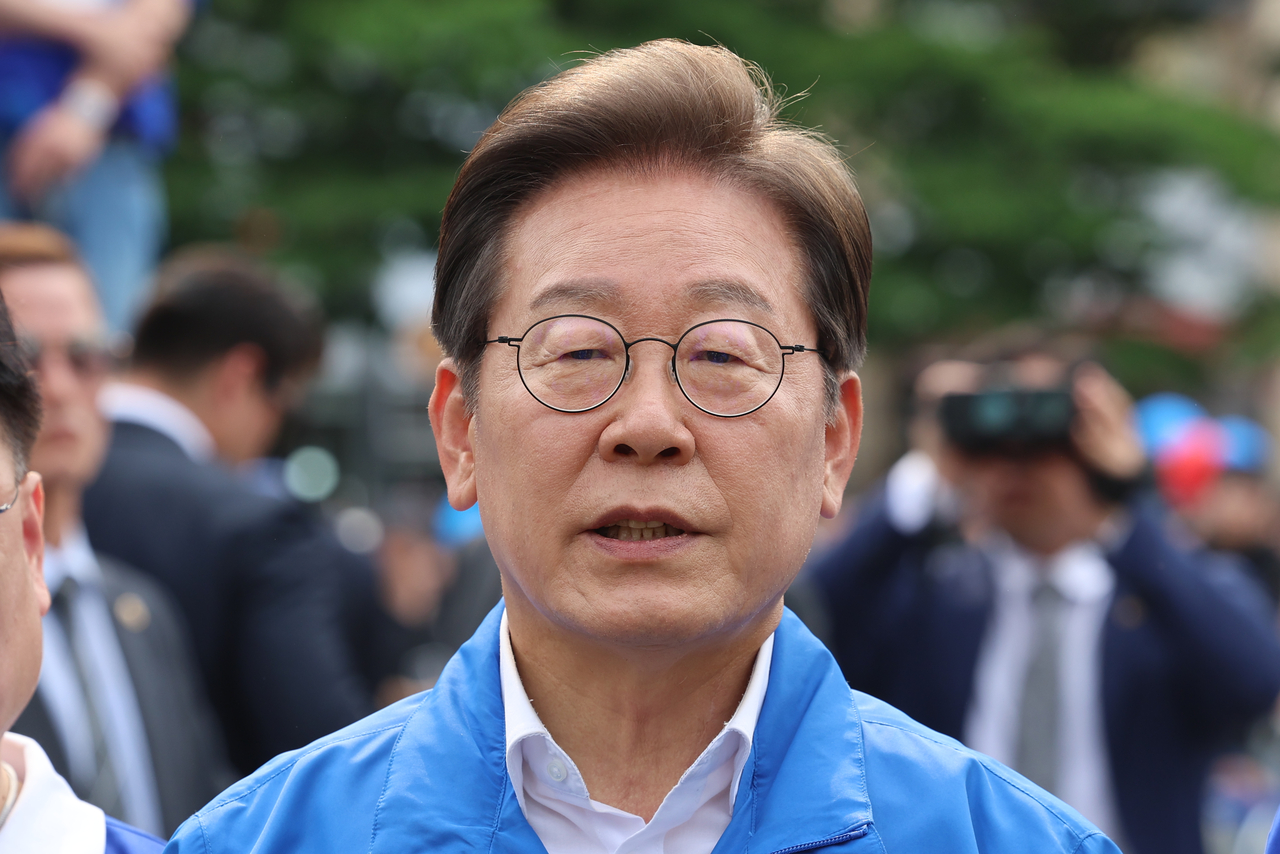 | 이재명 더불어민주당 대선 후보가 31일 충북 청주시 오창프라자 앞 광장에서 집중유세를 마친 뒤 취재진의 질문에 답하고 있다. [연합] |