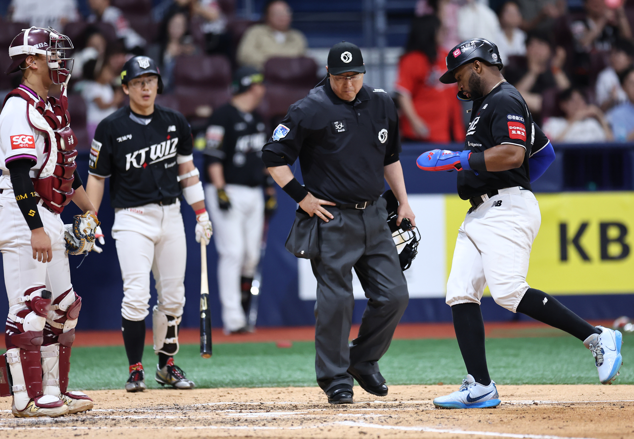 | 지난 25일 서울 고척돔에서 열린 2025 KBO리그 kt wiz 대 키움 경기에서 6회 초 1사 2,3루 때 kt 로하스가 키움 투수 박윤성의 보크로 홈인하고 있다. [연합뉴스] |