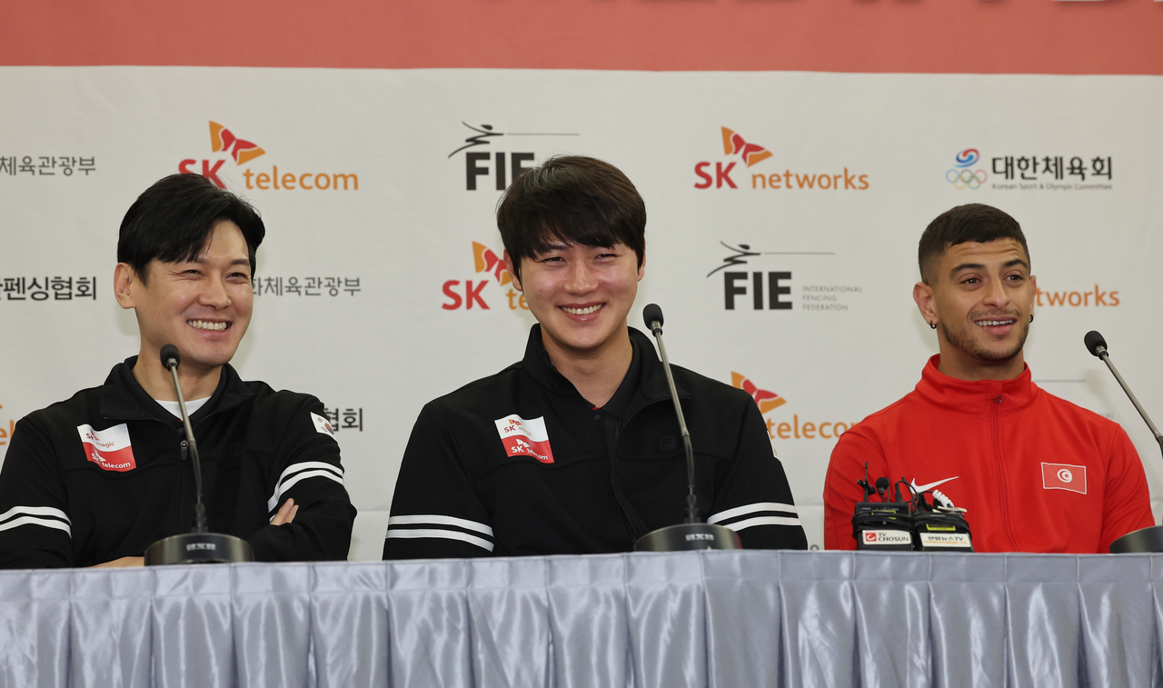 | 오상욱은 2025 국가대표 선수 선발전에서 우승을 차지했다. 사진은 지난 4월 서울 송파구 올림픽파크텔에서 열린 ‘2025 서울 SK텔레콤 국제그랑프리’ 미디어데이에서 오상욱을 비롯한 선수들이 미소짓는 모습. 왼쪽부터 구본길, 오상욱, 파레스 페르자니. [연합뉴스] |