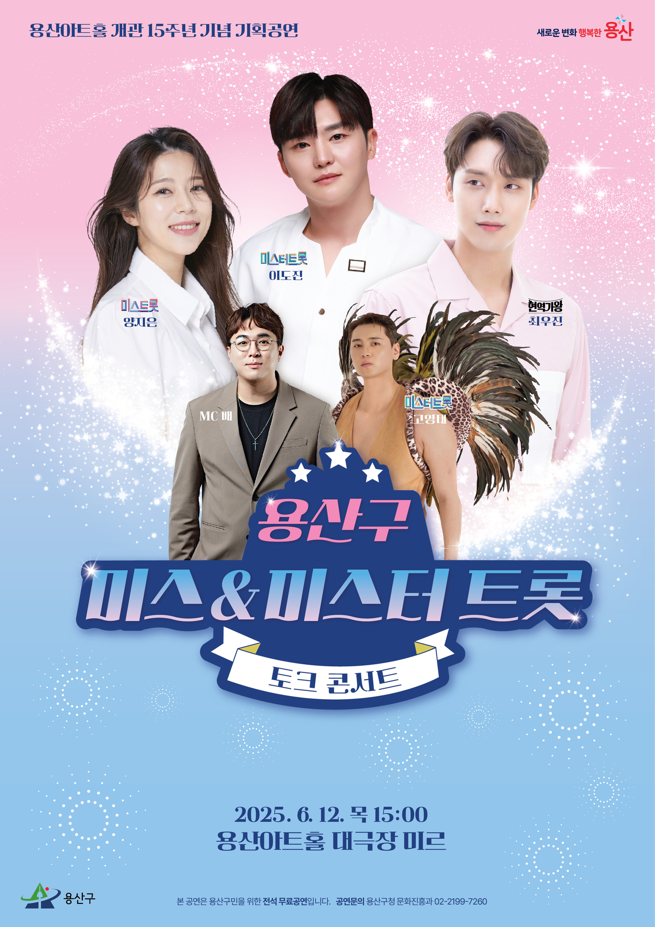 [헤럴드경제=박종일 기자]서울 용산구(구청장 박희영)가 용산아트홀 개관 15주년을 기념해 오는 6월 12일 오후 3시 대극장 ‘미르’에서 ‘미스&미스터 트롯 토크콘서트’를 개최한다.