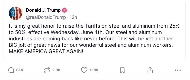 | 도널드 트럼프 대통령이 지난 30일 자신의 사회관계망서비스 트루스소셜에 “철강 및 알루미늄 수입 제품에 대한 관세를 25%에서 50%으로 인상하겠다”며 쓴 게시글. [트루스소셜 캡처] |