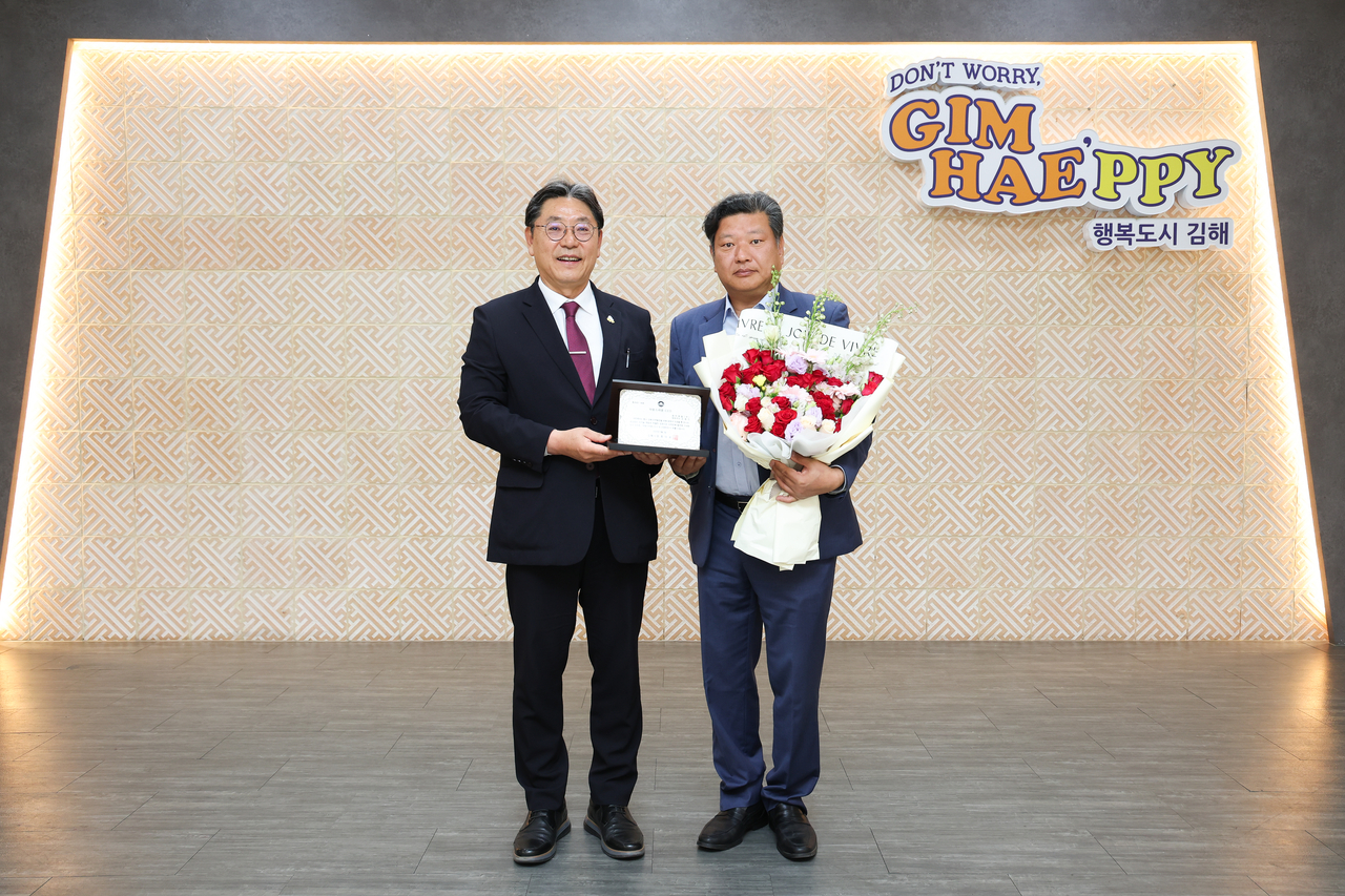 | 김용진(오른쪽) 정아정밀 대표가 2일 홍태용 김해시장에게 ‘6월 자랑스러운 김해 CEO상’을 받고 기념 촬영을 하고 있다. [김해시 제공] |