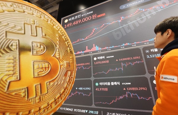 | 서울 서초구 빗썸라운지에 비트코인 시세가 표시돼 있다. [연합] |