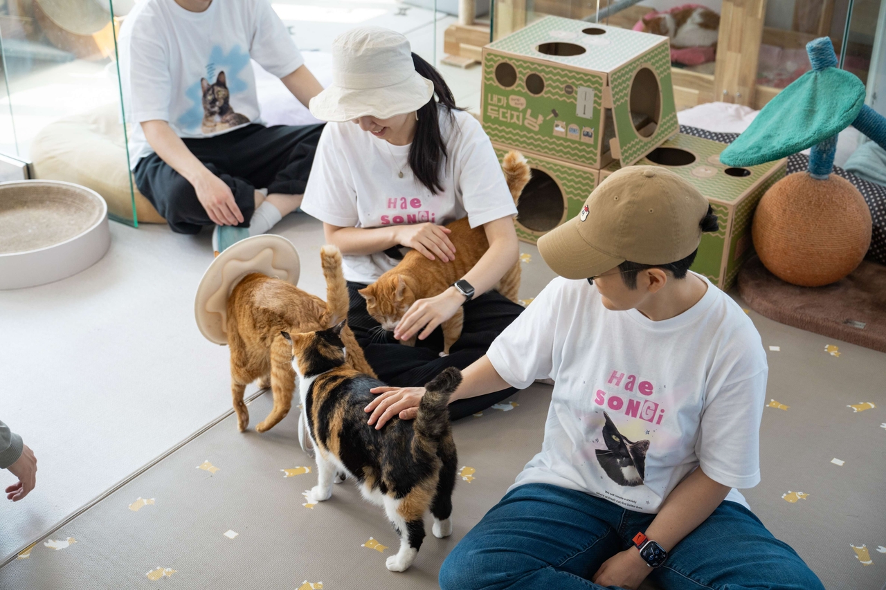 | 토스뱅크 임직원들이 동물 보호소에서 고양이들을 돌보고 있다. [토스뱅크 제공] |