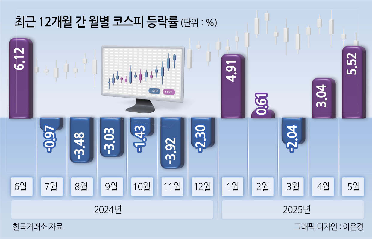 헤럴드경제가 한국거래소 정보데이터시스템을 활용해 2001~2025년 코스피 지수 월별 평균 등락률을 분석해 얻어낸 5월 평균 수익률은 0.10%였다. 마이너스(-) 수익률을 기록한 6월(-0.66%), 9월(-0.6%), 10월(-0.57%), 8월(-0.38%) 등에 비해선 수익률이 더 높았지만, 플러스(+) 수익률을 기록한 달 중에선 수익률이 가장 저조했다.
