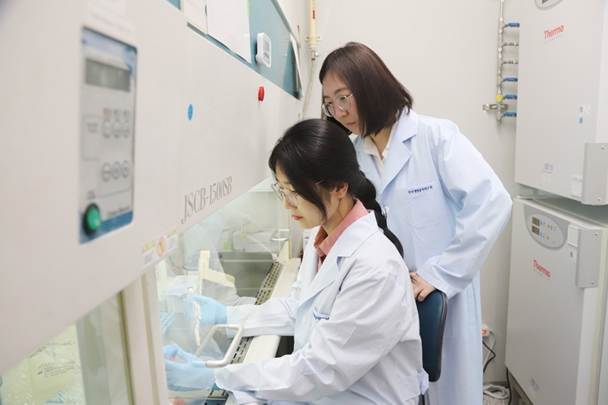 | 이미옥(오른쪽) 박사와 이영선 UST 학생이 오가노이드 관련 연구를 수행하고 있다. [한국생명공학연구원 제공] |