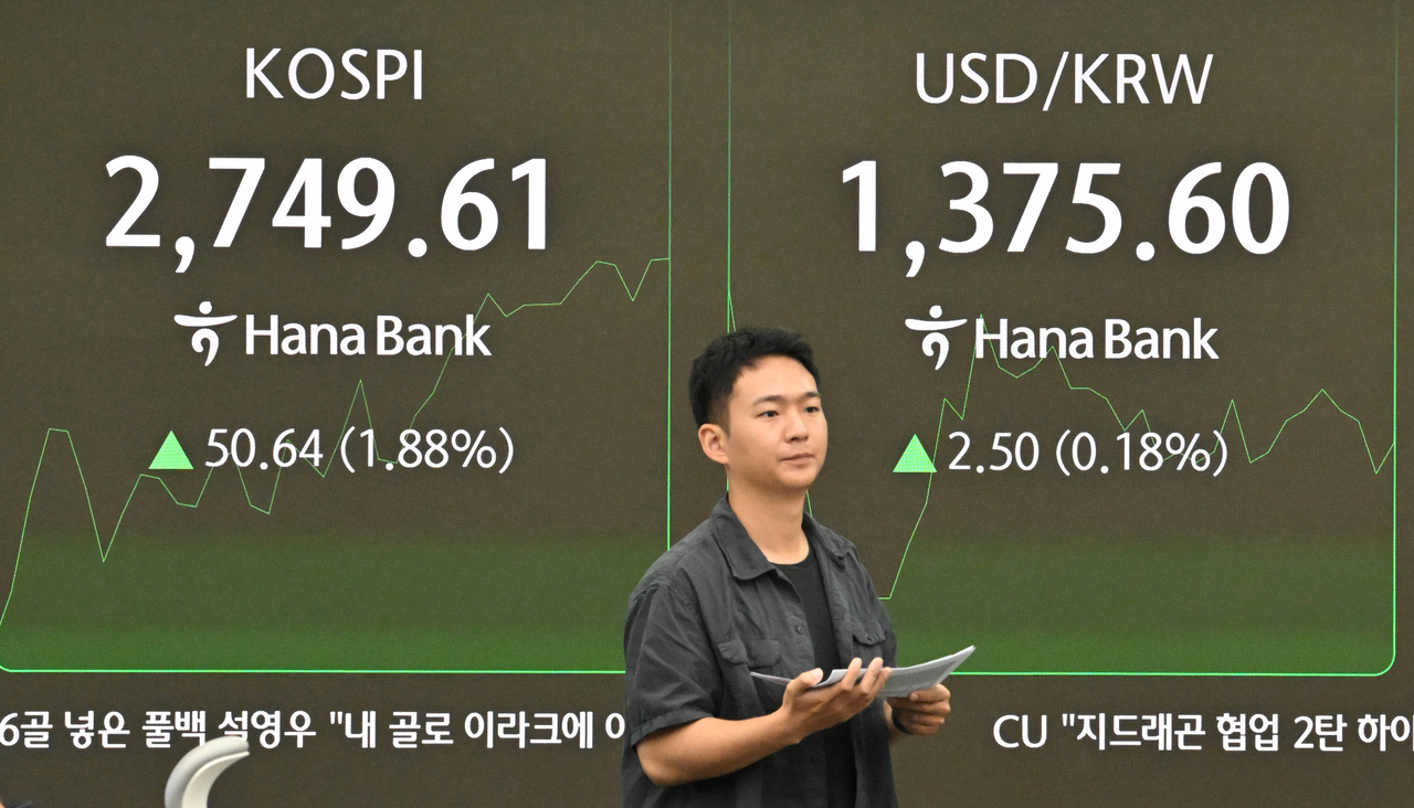 | 이재명 대통령 취임 첫날인 4일 코스피가 1% 넘게 상승하며 연고점을 돌파했다. 전 거래일 대비 38.95포인트(1.44%) 오른 2737.92에 거래를 시작했다. 오전 9시 38분 기준 코스피 지수는 전 거래일보다 50.64포인트 오른 2749.61를 나타냈다. 환율은 전 거래일 대비 1.9원 오른 1375.0원에 거래를 시작했다. 임세준 기자 |
