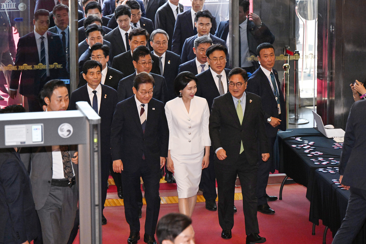 | 제21대 대한민국 대통령으로 취임한 이재명 대통령과 부인 김혜경 여사가 4일 오전 서울 여의도 국회 로텐더홀로 들어가고 있다. [국회사진기자단] <연합> |