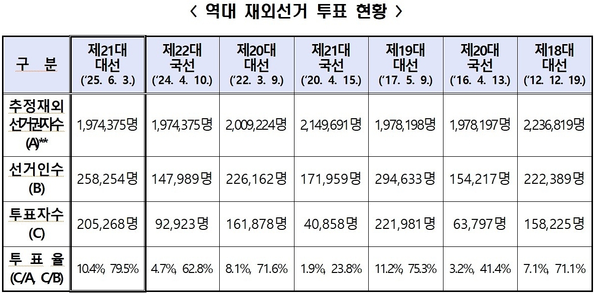 이재명 대통령이 제21대 대선 재외국민 투표에서 국민의힘 김문수 후보의 3배가 넘는 압도적 지지를 받은 것으로 나타났다.4일 동포사회와 중앙선거관리위원회에 따르면 전국 17개 시도 선거 통계 분석 결과 재외국민 투표자는 20만5천268명이다.선거인 25만8천254명을 기준으로 하면 역대 최고인 79.5%의 투표율을 기록했다.