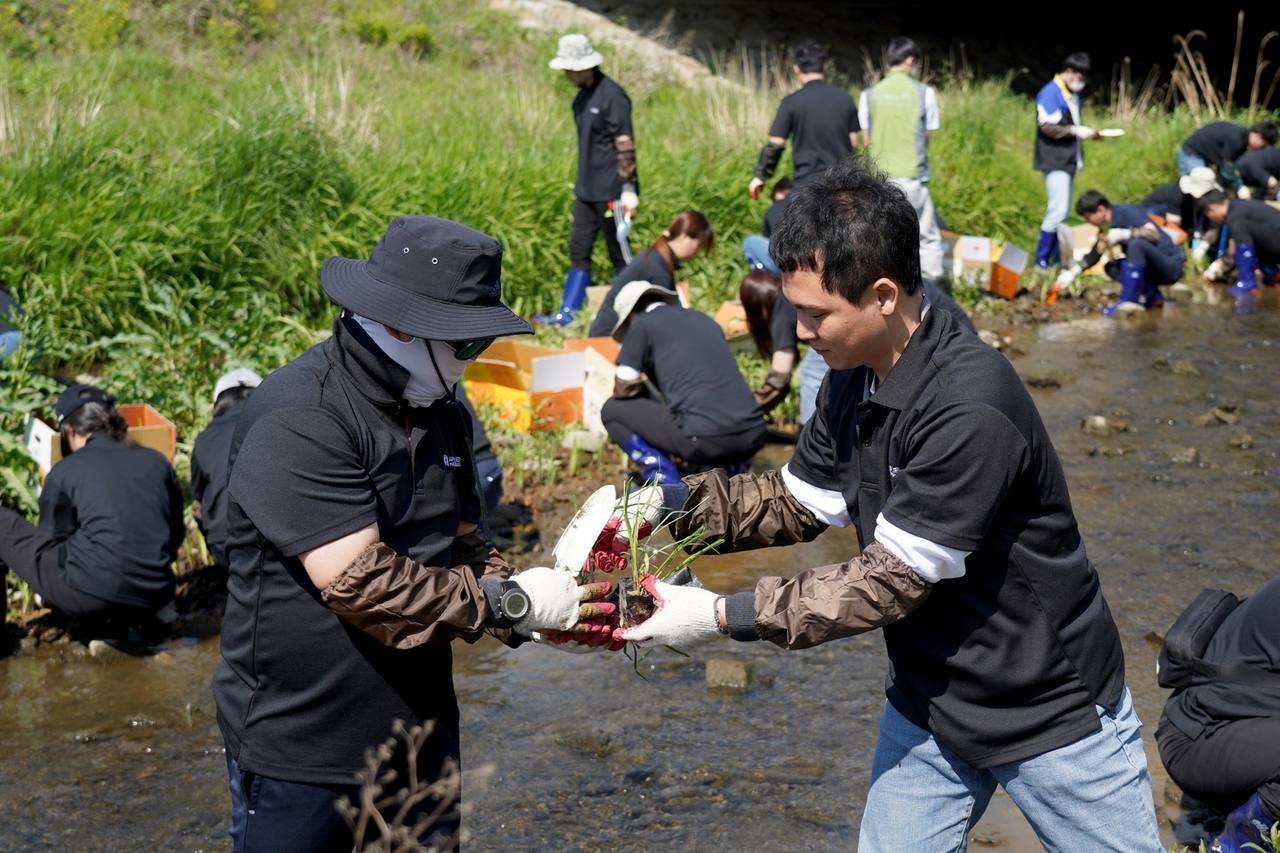 | 어플라이드 머티어리얼즈 코리아 임직원들이 하천 생태계 복원을 위해 수질정화식물을 식재하고 있다. [어플라이드 머티어리얼즈 제공] |