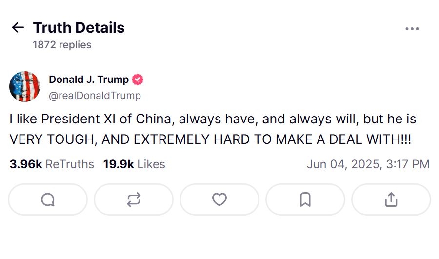 이런 상황에서 이날 트럼프 대통령이 사회관계망서비스(SNS)에 글을 남기자, 시 주석과의 통화가 여전히 어려운 것 아니냐는 분석이 나온다. 이날 새벽 2시 트럼프 대통령은 트루스소셜에 시 주석을 두고 “매우 힘들고 협상하기에 극도로 어려운 상대”라며 “나는 중국의 시 주석을 좋아하고, 언제나 그랬으며, 항상 그럴 것이지만, 그는 매우 힘들고(tough), 협상을 하기에 극도로 어렵다”고 적었다.