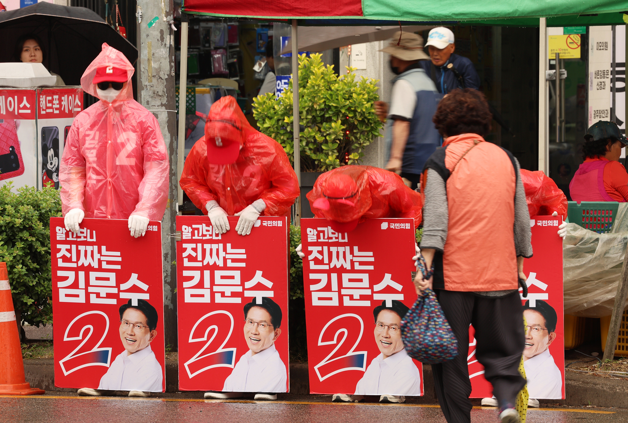 | 사진은 기사와 무관. 제21대 대통령선거를 하루 앞둔 지난 2일 오전 광주 북구 말바우시장에서 국민의힘 김문수 후보 선거운동원들이 유세 활동하고 있다. [연합] |