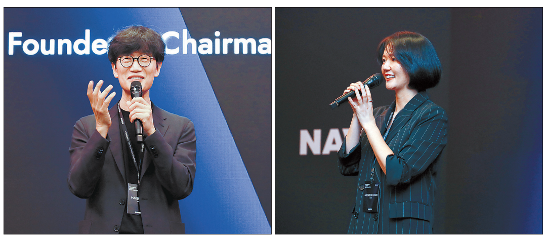 | 이해진(왼쪽) 네이버 창업자 겸 이사회 의장과 최수연 네이버 대표가 지난 5일(현지시간) 미국 실리콘밸리에서 네이버 벤처스 네트워킹 행사에 참여해 발표를 진행하고 있다. [네이버 제공] |