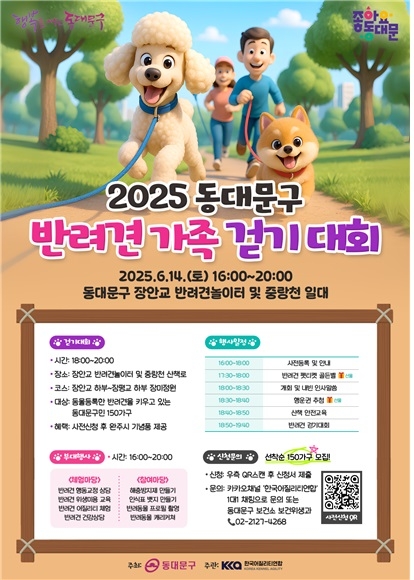 [헤럴드경제=박종일 기자]서울 동대문구(구청장 이필형)는 오는 14일 중랑천 장안교 하부에 위치한 반려견 놀이터 일대에서 ‘2025 동대문구 반려견 가족 걷기대회’를 개최한다.