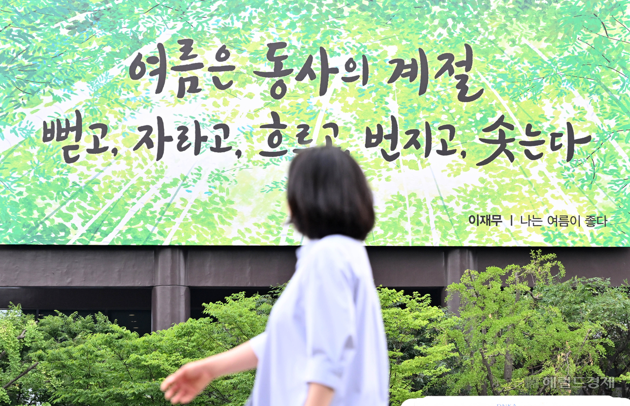 [헤럴드pic] 광화문글판 여름편 개편 글꼴 선택 본문 텍스트 크게본문 텍스트 작게 인쇄 [헤럴드경제=임세준 기자] 9일 오전 서울 종로구 교보생명빌딩 외벽에 이재무 시인의 시 ‘나는 여름이 좋다’의 한 구절 “여름은 동사의 계절 뻗고, 자라고, 흐르고, 번지고, 솟는다”로 제작된 광화문글판 여름편이 걸려있다. 교보생명은 이번 문안에 대해 ‘여름을 덥고 지치는 계절이 아니라, 역동적으로 변화하며 성장하는 시간으로 바라 보고 각자의 무궁무진한 가능성, 긍정의 에너지를 끊임없이 펼쳐 나가자’라는 메시지를 담았다고 밝혔다.