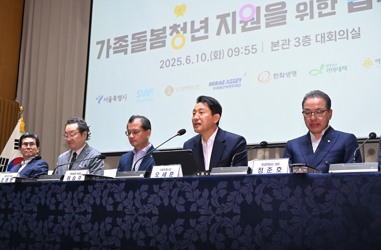 서울시는 10일 오전 서울시청(3층 대회의실)에서 미래에셋 박현주재단·아름다운재단·롯데백화점·희망친구 기아대책·한화생명 ·월드비전과 가족돌봄청년 지원을 위한 업무협약을 체결했다고 10일 밝혔다.