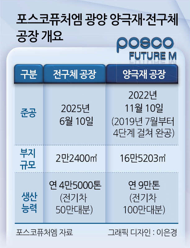 포스코퓨처엠의 광양 전구체 공장은 총 2만2400㎡(약 6800평) 크기로 조성됐으며, 연간 4만5000톤 규모의 전구체 생산이 가능하다. 이는 전기차 50만대 분량의 배터리를 만들 수 있는 양이다. 여기서 생산되는 전구체는 전량 얼티엄셀즈향 양극재 제조에 사용될 예정이다.